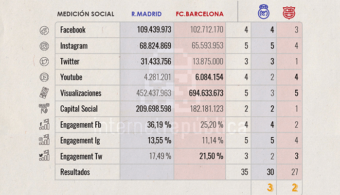 La gran rivalidad entre ambos equipos ha sido por décadas, es impensable hablar del Real Madrid sin hacer comparación con el Barcelona. Y en este caso no lo podemos dejar de lado. La competencia entre ambos equipos ha llegado al mundo digital y los números están muy parejos en la cantidad de seguidores, e interacciones con el contenido de las páginas. Y es el contenido visual lo que más busca el fan en las redes sciales de ambos equipos. De acuerdo con la tabla siguiente el Real Madrid vence al Barcelona en la estrategia digital para las redes sociales.